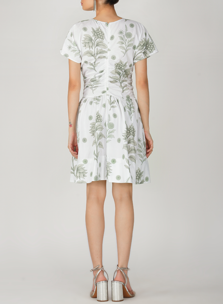 Infuse your wardrobe with the charm of the Ello Dress. Made from lightweight cotton, this mini dress features a flattering V-neckline and a ruched bodice that creates a defined shape. The short, relaxed sleeves and a gently flared skirt add to its playful and comfortable feel. The delicate, all-over botanical print gives it a fresh, feminine touch, making this piece perfect for a warm day.