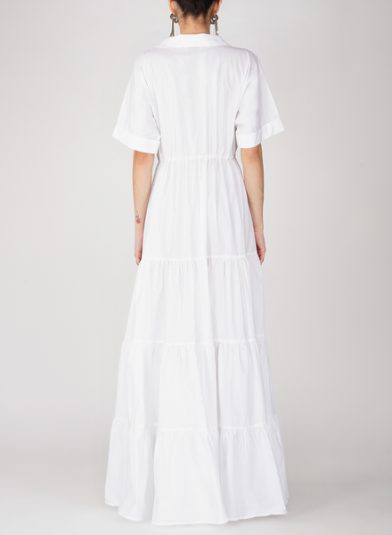 Leona Dress is a perfect blend of comfort and style, this tiered maxi dress is a wardrobe essential. Crafted from breathable BCI cotton, it offers a soft feel and a beautiful drape. The Leona features a classic shirt collar, a V-neckline, and a relaxed, tiered silhouette for a comfortable and effortless fit. An elasticated waistband cinches the waist, creating a flattering shape while maintaining ease of wear.