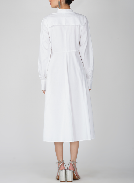 The Sabi Dress is a striking blend of classic and modern style. This pristine white dress features a unique high neckline and a button-down bodice that adds a touch of sophistication. A dramatic, cape-like overlay drapes elegantly over the shoulders and down the back, creating a sculptural silhouette. The long sleeves are finished with refined buttoned cuffs, while the flowy skirt provides a graceful finish. This is a truly unique dress for those who want to make a subtle, yet powerful statement.