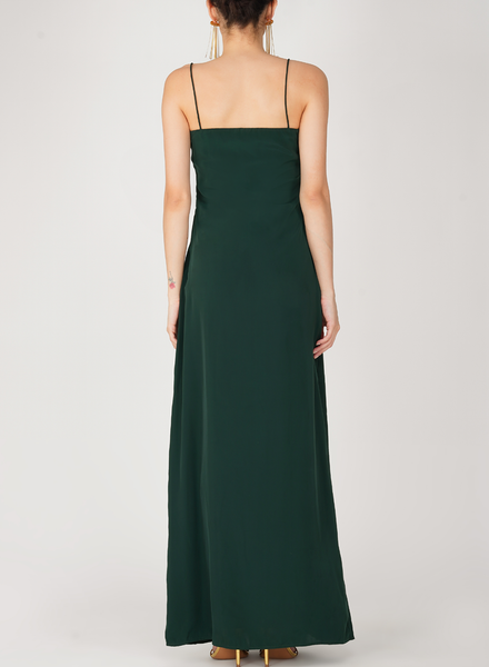 Embrace elegant minimalism in the Valentina Dress. This dark green french crepe dress features a clean, sophisticated silhouette with a straight neckline and delicate spaghetti straps that crisscross at the back. Its form-skimming design drapes gracefully to the floor, making it a timeless and versatile piece for any special occasion.