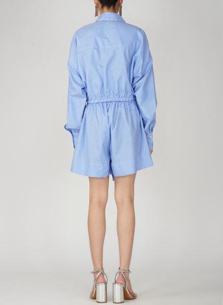 This is a modern update on the classic striped shirt, crafted in airy cotton with a relaxed fit. Featuring a sharp collar, button-down front, and an elongated tie-up detail at the waist, it lets you style it loose or cinched for a more defined silhouette. Available in blue and brown stripes, it’s a versatile piece that works from day to night. Pair it with the Mira Shorts in matching stripes for a coordinated summer look, or style it with denims for an effortless vibe.