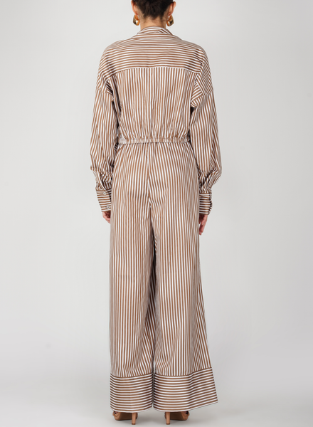 This is a modern update on the classic striped shirt, crafted in airy cotton with a relaxed fit. Featuring a sharp collar, button-down front, and an elongated tie-up detail at the waist, it lets you style it loose or cinched for a more defined silhouette. Available in blue and brown stripes, it’s a versatile piece that works from day to night. Pair it with the Mira Shorts in matching stripes for a coordinated summer look, or style it with denims for an effortless vibe.