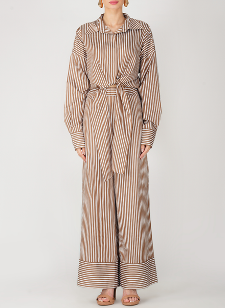 These striped Mica wide-leg pants are designed in soft, breathable fabric with a relaxed silhouette, featuring an elasticated waistband for comfort and contrast paneling at the hem for a modern touch. Style them with the brown Vittoria Top for a chic, balanced look, the top’s structured shape complements the easy flow of the pants, making it a refined choice for both day and evening wear.