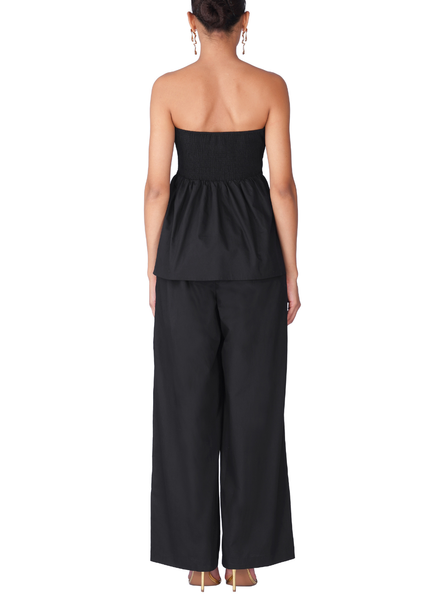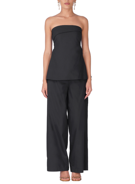 Norlune Top is a study in minimalist chic, featuring a streamlined, strapless silhouette with a clean-cut neckline. The bodice is tailored from crisp black cotton to provide a secure, structured fit that subtly flares into a gentle peplum hem. It’s a versatile piece designed for sophisticated cocktail hours or elevated evening events. For the ultimate coordinated aesthetic, pair it with our matching black Norlune pants.