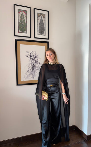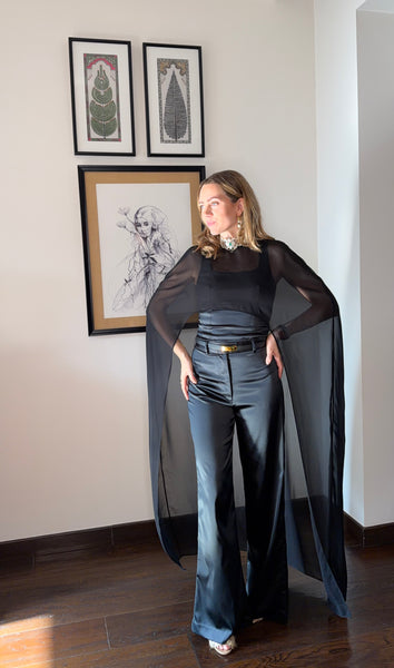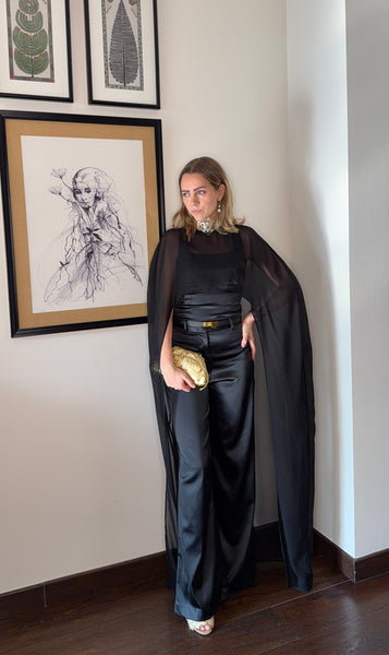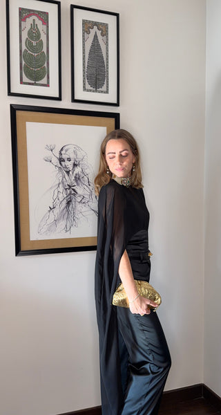 The Onyx Set exudes quiet confidence and modern sophistication. Crafted in fluid black satin, the ensemble pairs a structured tank and tailored trousers with a sheer georgette cape that drapes effortlessly from the shoulders. The contrast of sleek satin and airy chiffon adds depth and movement, creating a look that’s both powerful and ethereal. Perfect for evening soirées or statement occasions, this set redefines contemporary elegance with its graceful yet commanding presence.